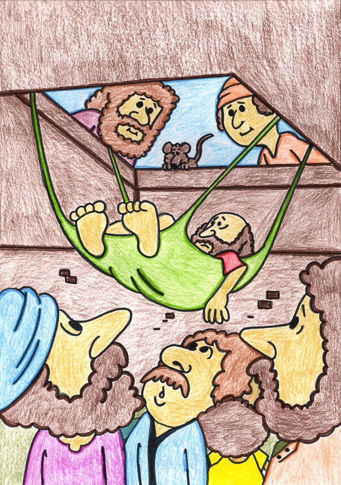 Por isso, decidiram subir no telhado da casa onde Jesus estava e fizeram um buraco no telhado da casa e desceram o amigo para dentro da casa.
